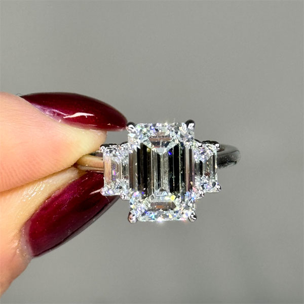 Nổi bật với 2 viên kim cương Lab Grown Emerald tổng trọng lượng 1,0 carat và một viên kim cương Lab Grown được chứng nhận IGI 4.0 carat, màu E và độ sạch VVS2 làm trung tâm.